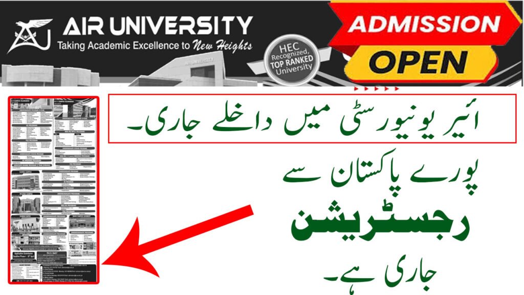 Air University has officially announced Air University Admission Open Fall 2026 Apply Online for multiple undergraduate, graduate, MS/MPhil, MBA, and PhD programs across its campuses including Islamabad, Kamra, Multan, Kharian, Bahu (Shorkot), and Karachi. The university, recognized by Higher Education Commission and ranked internationally by QS World University Rankings and Times Higher Education, offers modern smart classrooms, advanced research laboratories, digital libraries, and merit-based scholarships up to 100%. Students interested in engineering, computing, business, social sciences, aviation, cybersecurity, and many other disciplines can now apply online before the Phase-I deadline of 20 April 2026 through the official admission portal.