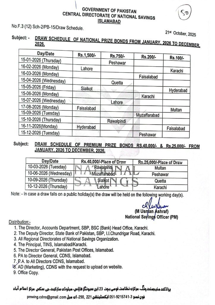 All Prize Bond Draw Schedule 2026 Complete Dates has been officially announced by the Government of Pakistan, Central Directorate of National Savings (CDNS), Islamabad. This comprehensive notification outlines the full National Prize Bond and Premium Prize Bond draw schedule from January 2026 to December 2026, including draw dates, days, denominations, and cities of draws. Designed for transparency and public convenience, this schedule helps prize bond holders plan ahead, verify draw timelines, and stay informed about official government prize bond draws conducted across Pakistan.