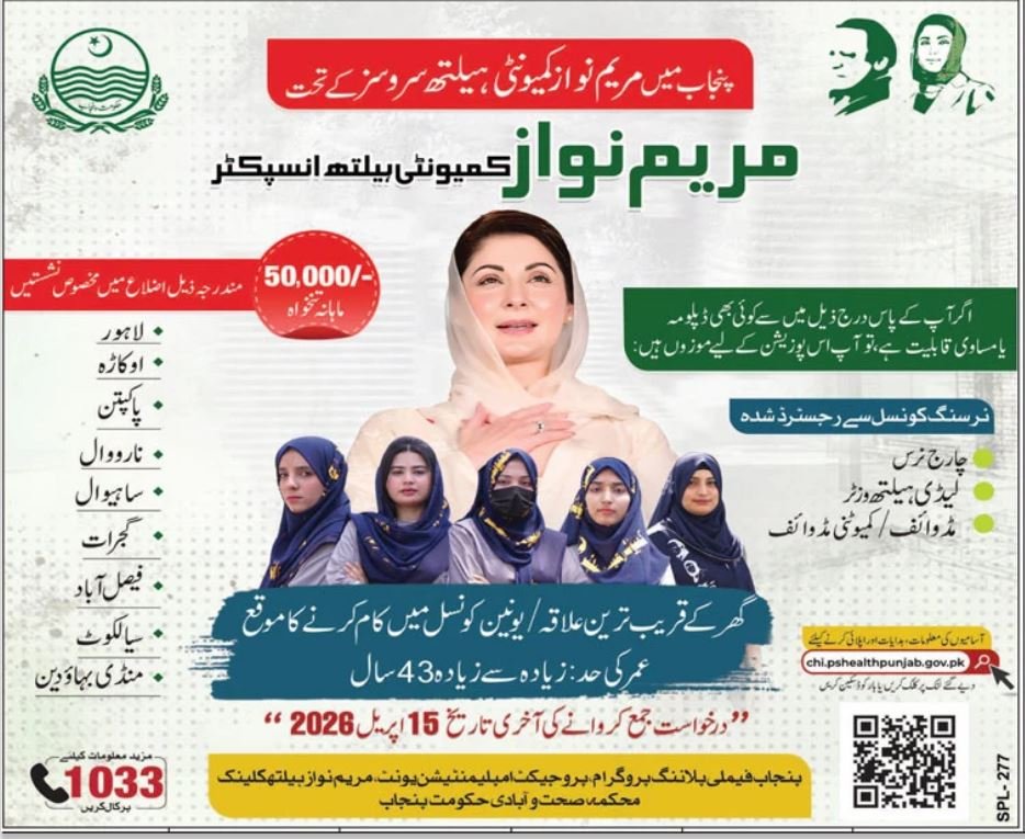 The CM Punjab Community Health Inspector Career Opportunities April 2026 Apply Now program has been officially announced under the Maryam Nawaz Community Health Services initiative by the Government of Punjab. This is an excellent opportunity for qualified female healthcare professionals such as registered nurses, Lady Health Visitors (LHVs), and midwives to serve their communities while earning a competitive monthly salary of up to PKR 50,000. The program focuses on deploying Community Health Inspectors in their nearest Union Councils across multiple districts of Punjab, ensuring accessible healthcare services at the grassroots level. Interested candidates must apply online before 15 April 2026 through the official portal.