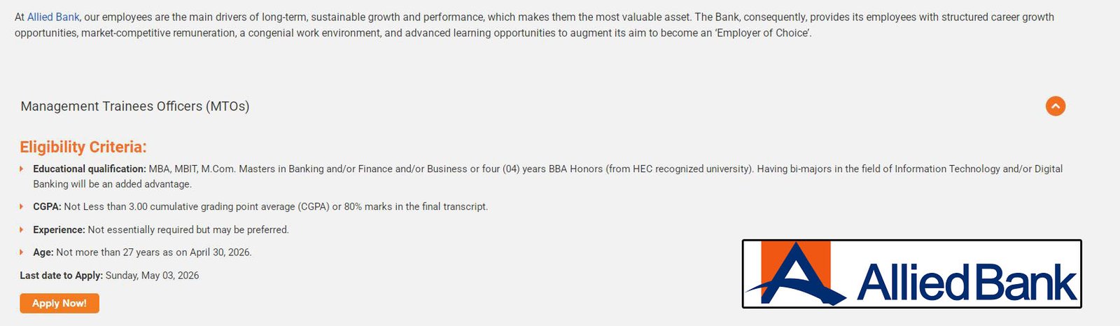Allied Bank Limited is hiring talented individuals for its prestigious MTO program with the following criteria: