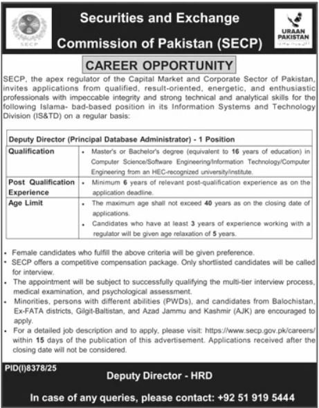The Security Exchange Commission of Pakistan SECP Jobs April 2026 Advertisement announces an excellent career opportunity for experienced IT professionals looking to work in a prestigious regulatory body. Securities and Exchange Commission of Pakistan is inviting applications for the position of Deputy Director (Principal Database Administrator) in its Information Systems and Technology Division (IS&TD), based in Islamabad. This role is ideal for candidates with strong technical, analytical, and database management expertise, offering a competitive salary package and a structured recruitment process. Interested applicants must apply online within 15 days of the advertisement publication.